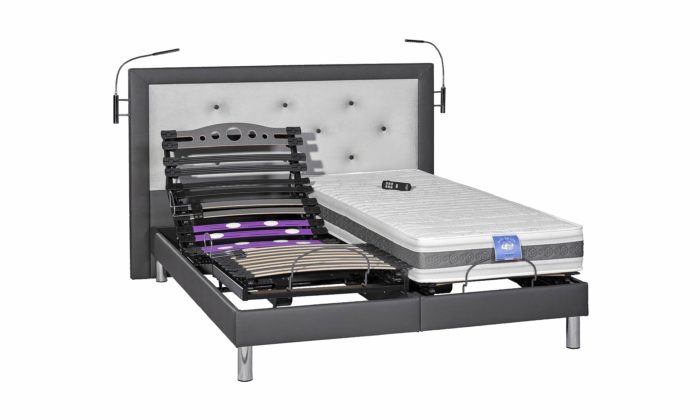 Un matelas avec matelas mousse alvéolaire avec 3 zones de confort. Avec un sommier en tissu gris.