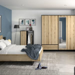 Corps et façades panneaux de particules revêtus papier imitation chêne Helvezia et uni noir. Verre clair argenté pour miroir armoire. Poignées panneaux de fibres moyenne densité enrobés papier imitation chêne Helvezia. Caisse de tiroirs panneaux de particules revêtus polypropylène noir sur coulisses à galets. Pieds ABS noir mat.